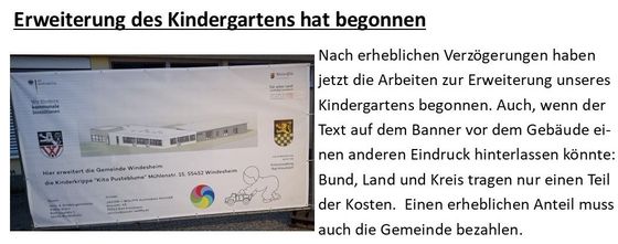 Bei der notwendigen Erweiterung unseres Kindergartens gibt es nunmehr Fortschritte. Nach erfolgter Ausschreibung soll die Ausführung verschiedener Baumaßnahmen (Abbruch- und Rohbauarbeiten, Zimmerarbeiten, Dachdeckerarbeiten, Fensterbauarbeiten) an die geringstbietenden Firmen vergeben werden.