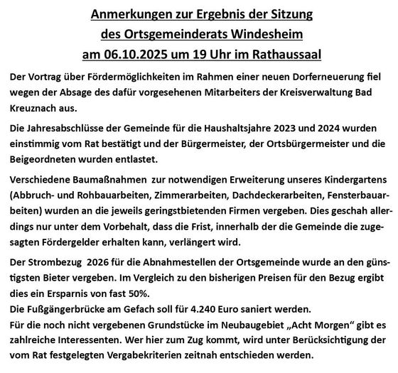 Anmerkungen zur Sitzung des Ortsgemeinderats Windesheim am 06.10.2025 um 19 Uhr im Rathaussaal