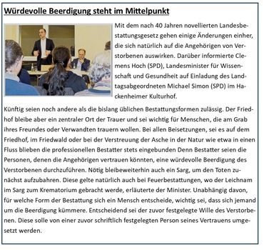 In der Sitzung des Friedhofsausschusses am 22. März wurden von einem Planer die Möglichkeiten für eine Gestaltung zumindest eines Teils unseres Friedhofs vorgestellt. Darüber, über weitere Bestattungsmöglichkeiten und einen Gesamtplan für das Friedhofsgelände soll im Ausschuss zusammen mit interessierten Windesheimerinnen und Windesheimern in der nächsten Sitzung gesprochen werden. Termin ist der 11. April um 16 Uhr auf dem Friedhof.