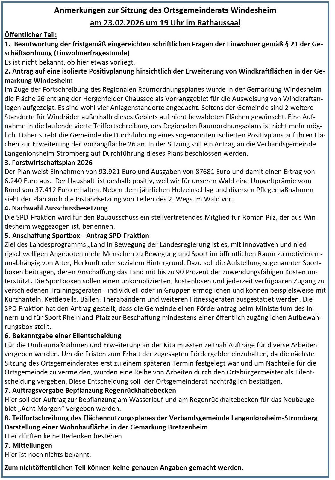 Anmerkungen zur Sitzung des Ortsgemeinderats Windesheim am 06.10.2025 um 19 Uhr im Rathaussaal