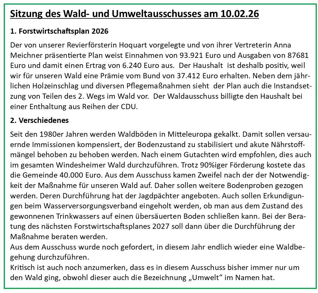 der Beschluss des Ortsgemeinderats vom 17.06.24 zur Windkraft irritierte einige Windesheimer Bürger. Zu deren Beruhigung: Dem Rat war dabei durchaus klar, dass für viele Jahre Windräder im Wald weiter nicht genehmigt werden. Man blieb trotzdem bei der Forderung, um sich die Möglichkeit in den nächsten Jahrzehnten, wenn sich die Lage bei der Energieversorgung vielleicht ändert, für Windanlagen offen zu halten.
