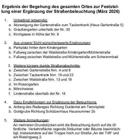 d. Es wurde an die schon länger beschlossene Ortsbegehung des Bauausschusses zur Feststellung schlecht beleuchteter Straßenbereiche mit dem Ziel, dort die Beleuchtung zu ergänzen, erinnert.